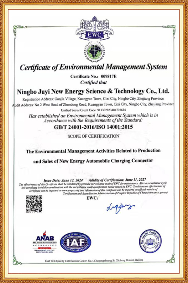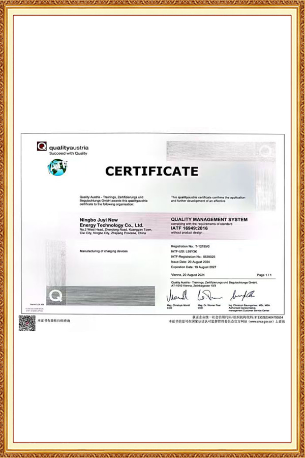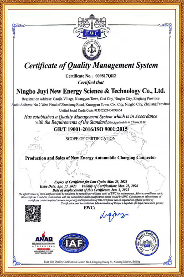 聚亿是国内首批通过CQC和德国TÜV充电连接器新标准的企业,并且已通过ISO9001质量管理体系认证;